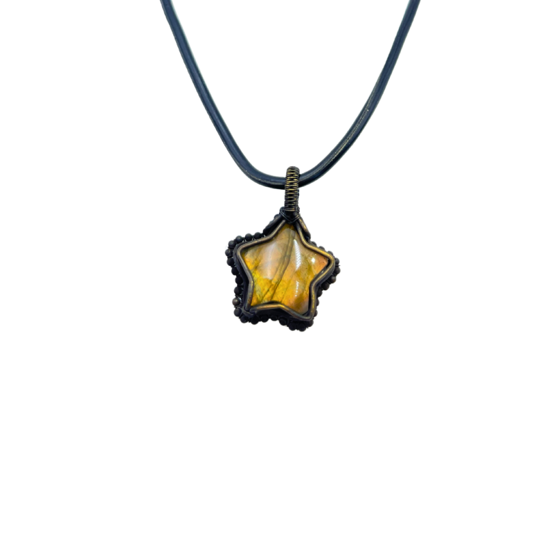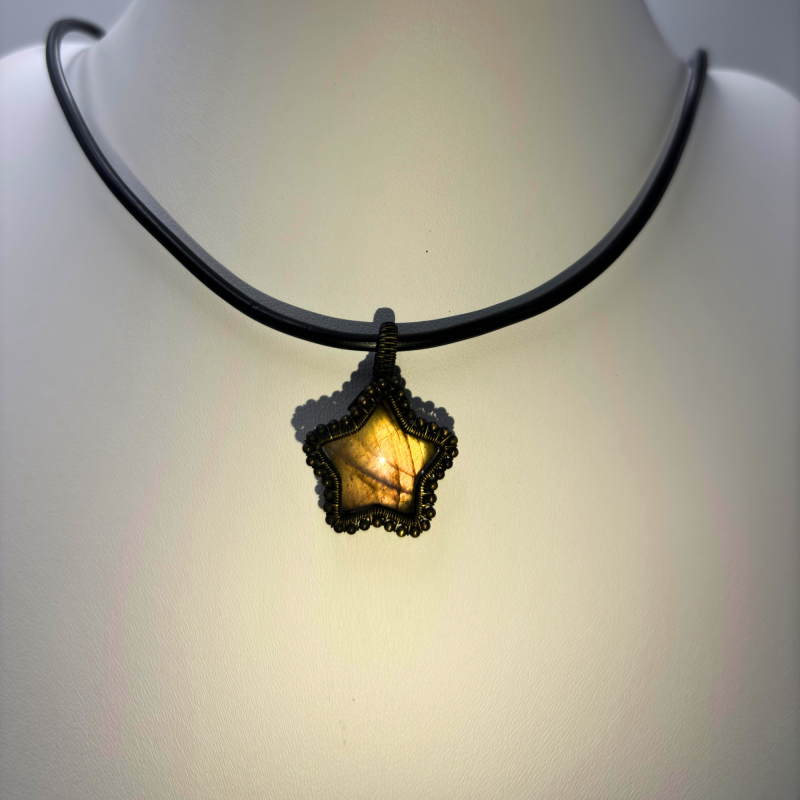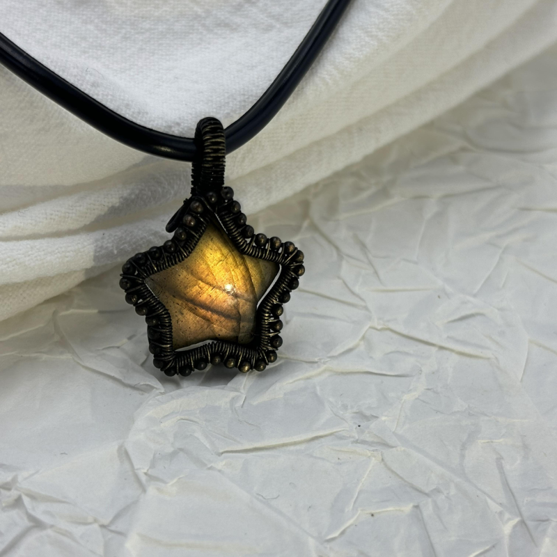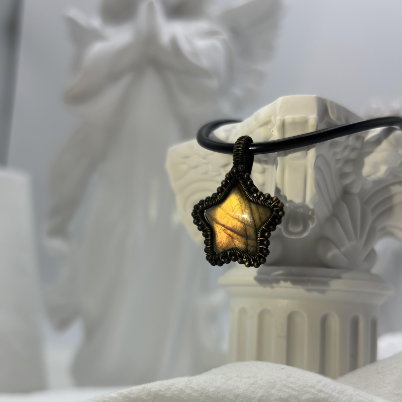 The sun-shaped labradorite is embraced by an intricately designed antique copper wire frame, handcrafted to enhance the celestial theme with delicate star motifs and swirling patterns reminiscent of Apollo's lyrical melodies. This vintage-inspired framework not only adds structural elegance to the piece but also creates a beautiful contrast against the shimmering hues of the labradorite, like the interplay of sunlight and shadow in the early morning sky.