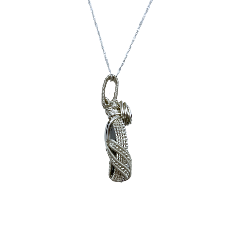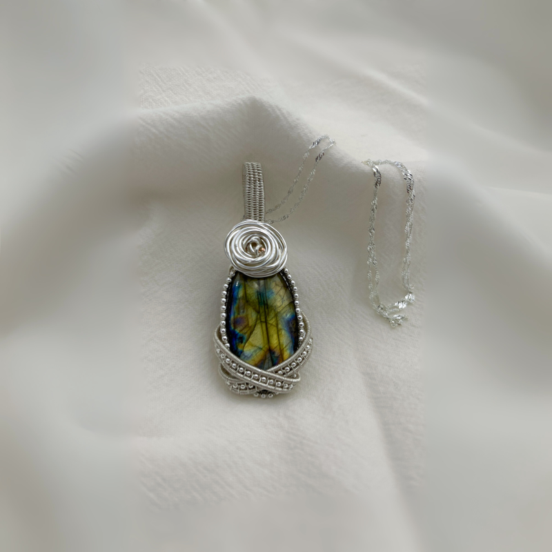 The labradorite is embraced by an intricately designed silver wire frame, handcrafted to resemble a swirling galaxy. This luxurious, wide border features dense wire wrapping techniques that create a sense of movement and depth, mirroring the dynamic energy flows of the cosmos. The front-to-back weaving method envelops the stone like a gentle cosmic current, transforming the pendant into a radiant planet suspended in the vastness of space.