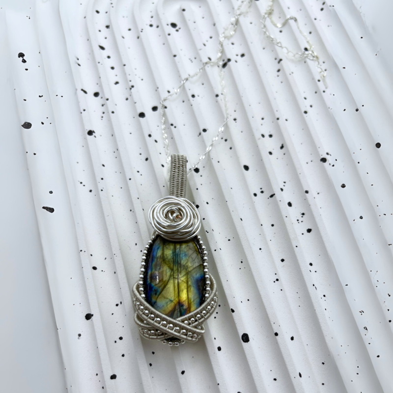 The interplay between the cool silver tones of the wire work and the vibrant, changing colors of the labradorite creates a visual symphony that captures the essence of a bohemian's interpretation of the universe. This attention to detail transforms the pendant into a wearable piece of art that bridges the gap between earthly craftsmanship and celestial inspiration.