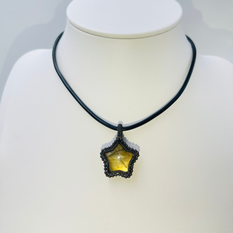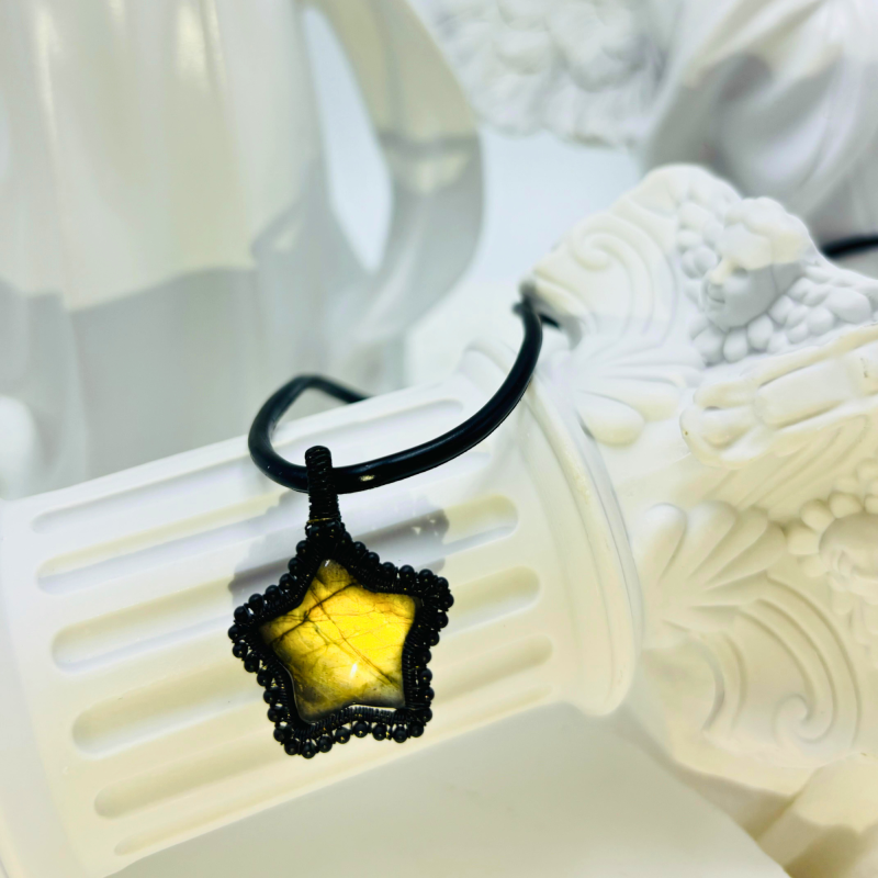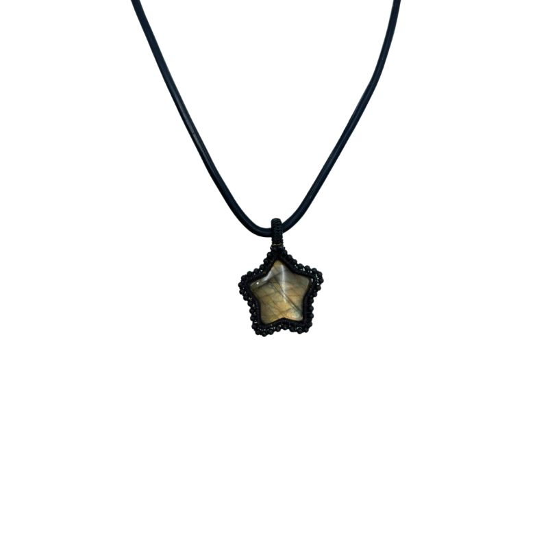 The star-shaped labradorite is embraced by an intricately designed copper wire frame, handcrafted to enhance the compass motif while evoking the warm glow of aged brass instruments. This delicate wirework not only adds structural elegance to the piece but also creates a beautiful contrast against the shimmering hues of the labradorite. Interspersed within the copper framework are silver beads, like tiny stars guiding the way or the cardinal points of a compass, adding a touch of celestial light to the vintage palette.