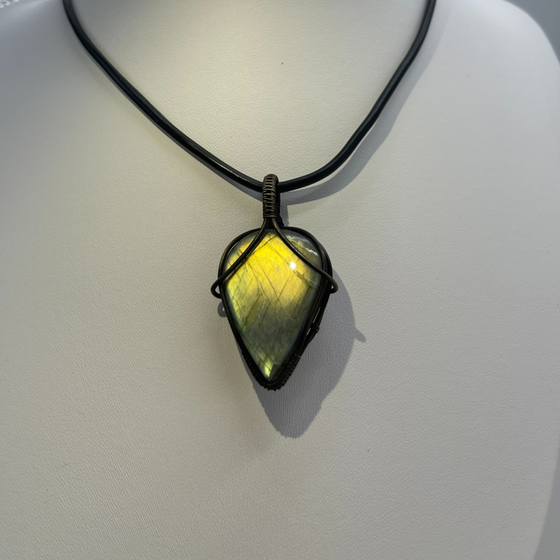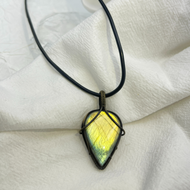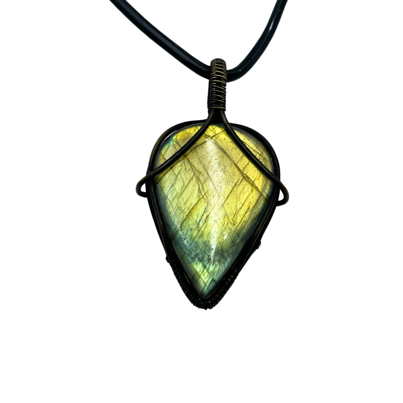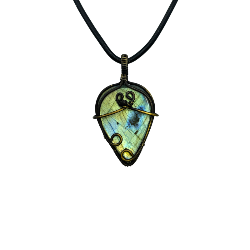 Embrace the radiance of hope with our Golden Dream pendant, featuring a mesmerizing natural Indian labradorite stone meticulously hand-cut into a unique radish heart shape and embraced by intricate vintage copper wire work reminiscent of sunbeams. This 13.7-gram masterpiece showcases the stone's captivating labradorescence, evoking the shimmering colors of golden aspirations. The innovative reversible design, with its figure-eight front and decorative back, creates a truly versatile accessory that embodies both timeless elegance and future possibilities. Perfect for dreamers and those who seek to manifest their deepest desires, this pendant represents the golden light of hope and the transformative power of imagination. Whether worn to display its sunlit elegance or reversed to reveal its intricate back, Golden Dream adds a touch of vintage charm and inspirational energy to any outfit.