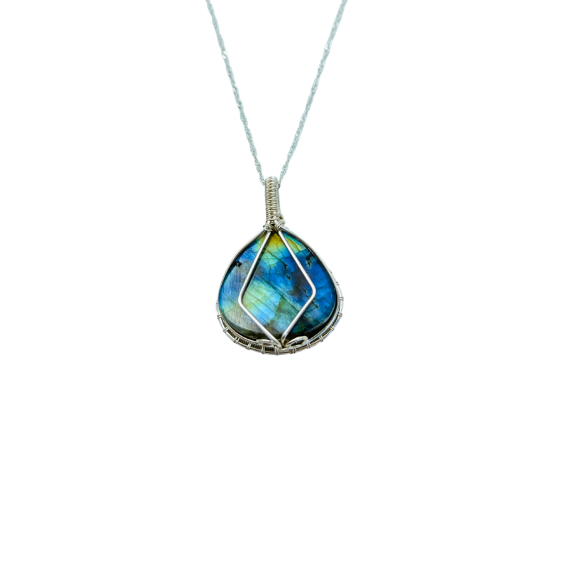 Each MISTY MORNING pendant is as unique as the labradorite at its center, ensuring that your piece is truly one-of-a-kind. The interplay between the copper wirework and the shimmering labradorite creates a harmonious blend of earthly and ethereal elements, resulting in a wearable piece of art that seems to have been plucked from a fairy tale forest.