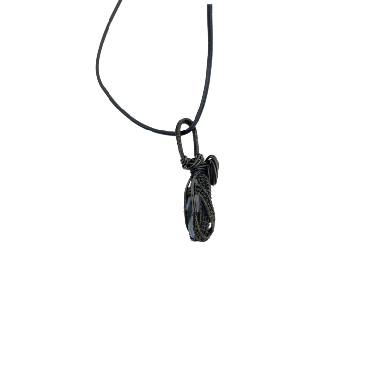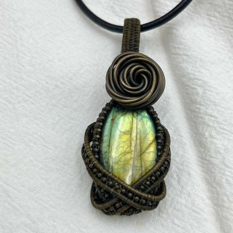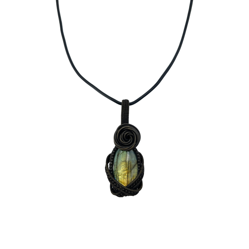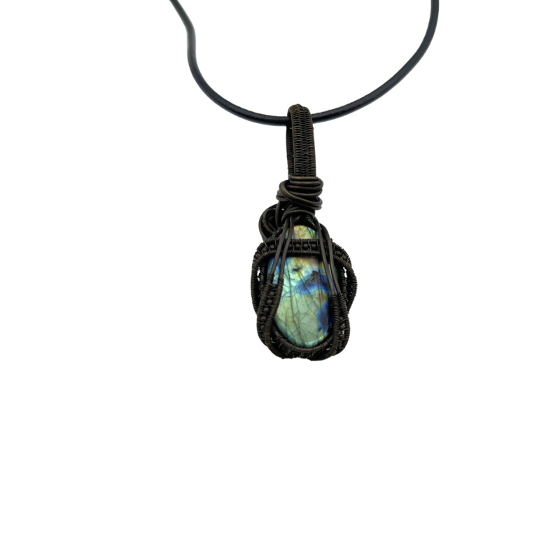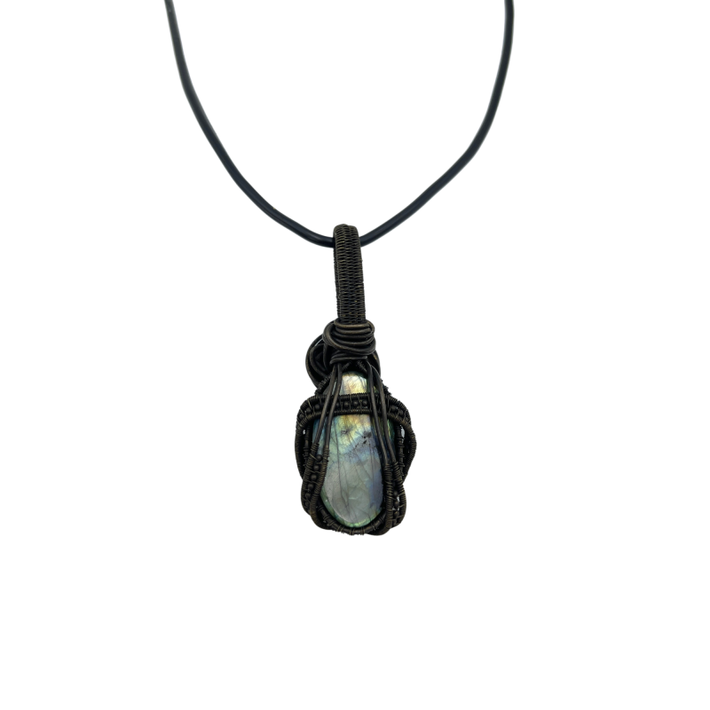 The labradorite is embraced by an intricately designed silver wire frame, handcrafted to resemble the intricate patterns of woodland growth. This luxurious, wide border features dense wire wrapping techniques that create a sense of organic movement and depth, mirroring the complex ecosystems of a forest floor. A delicate ribbon-like wrapping encircles the stone, reminiscent of a gentle stream winding through the woods, transforming the pendant into a microcosm of forest life.