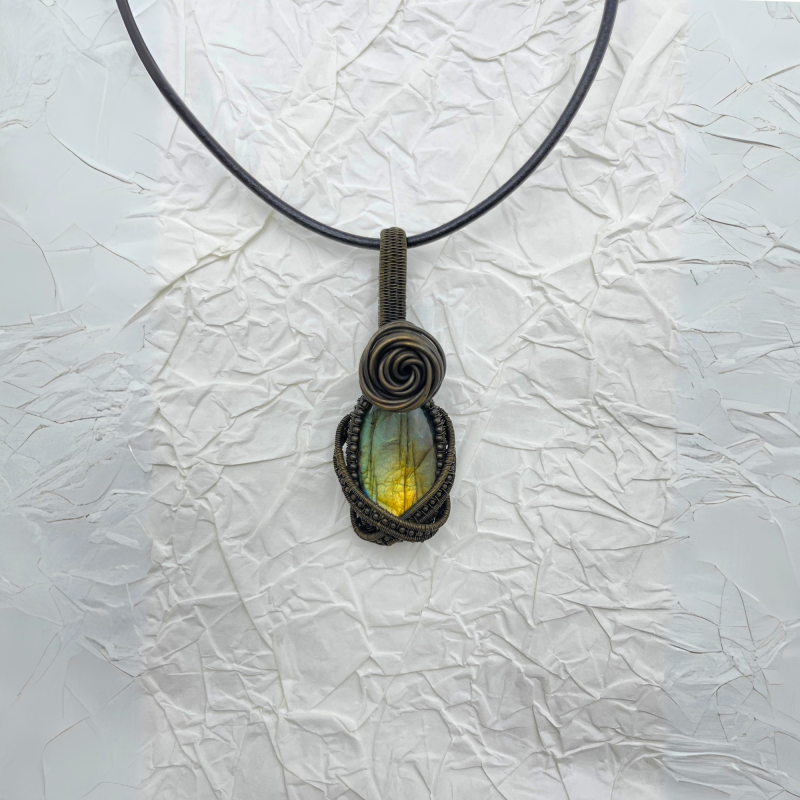 The interplay between the cool silver tones of the wire work and the vibrant, changing colors of the labradorite creates a visual symphony that captures the essence of a mystic forest. This attention to detail transforms the pendant into a wearable piece of art that bridges the gap between earthly craftsmanship and the magic of untamed nature.