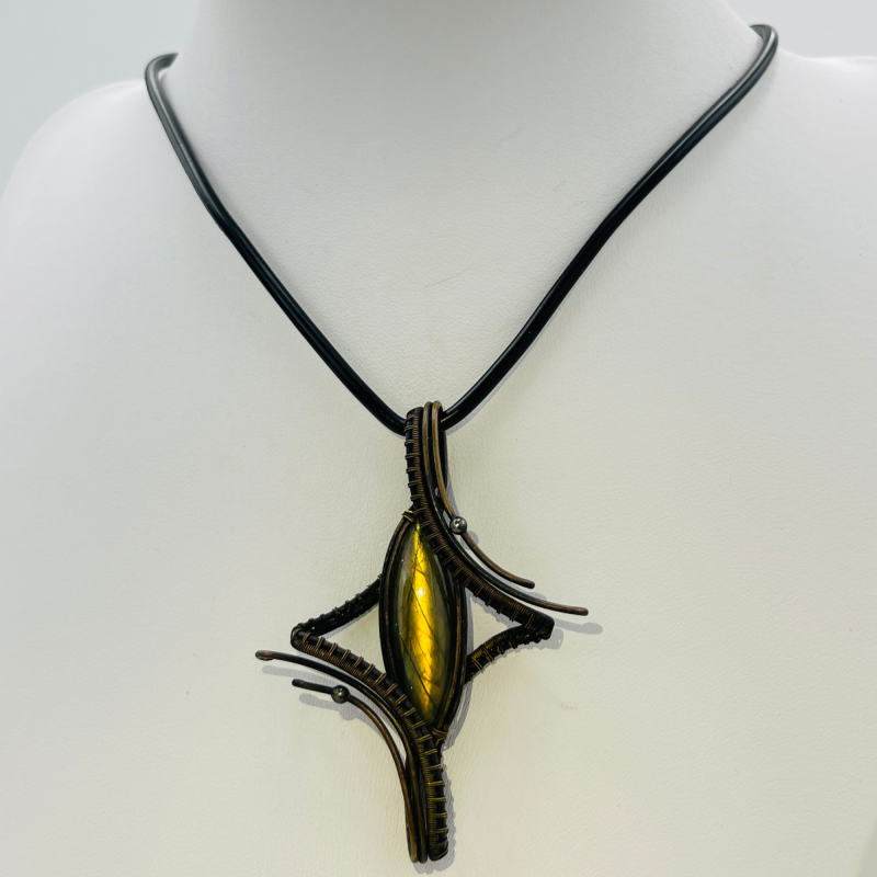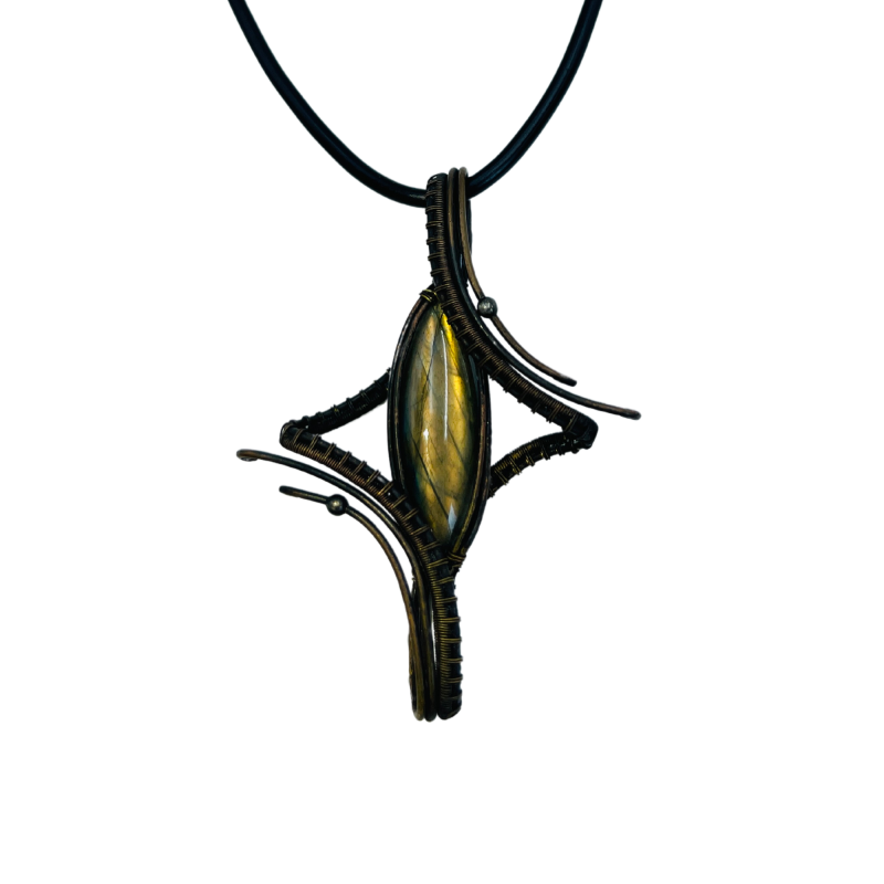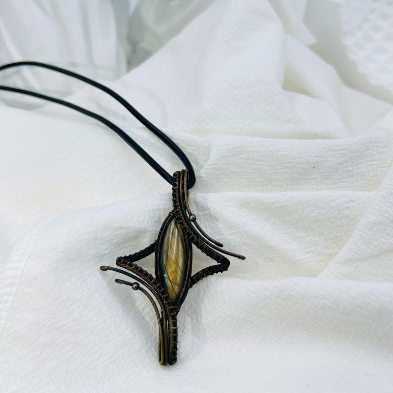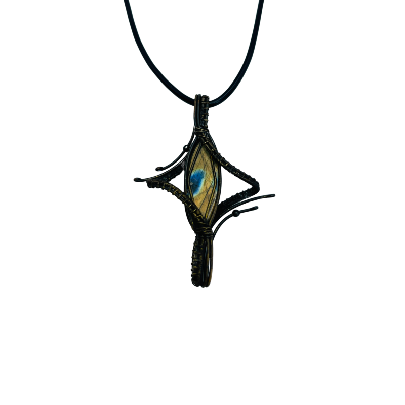 Crafted with meticulous attention to detail, this pendant features a natural Indian labradorite stone, carefully selected and precision-cut to showcase its inherent beauty. The stone is then artfully wrapped in copper wire, creating a distinctive four-point star design that symbolizes guidance and direction.