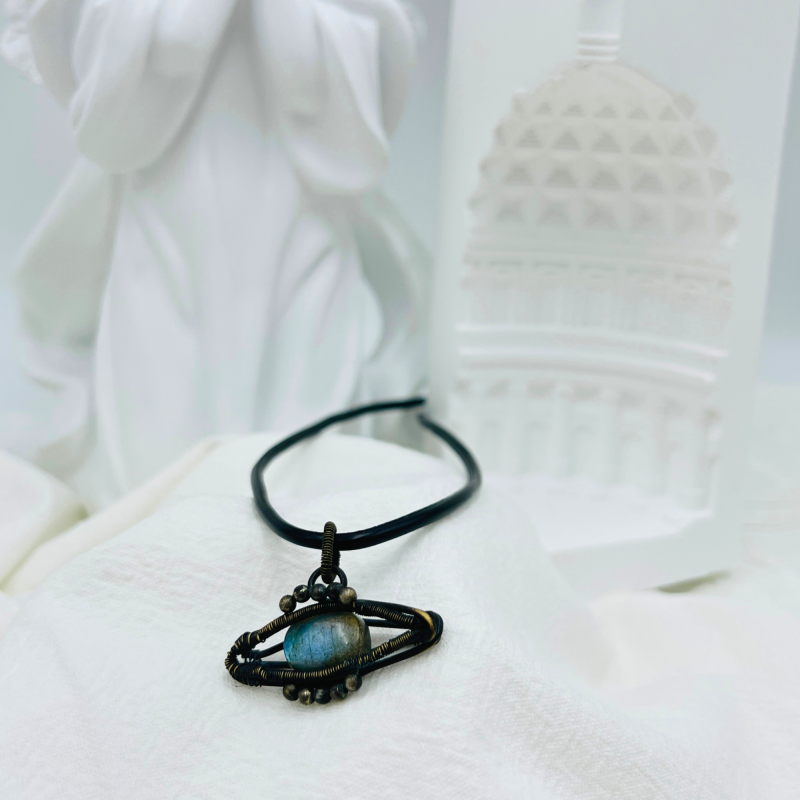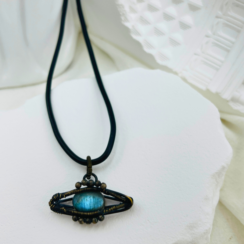 Embark on a journey through the celestial unknown with our Sky's Mystery pendant, a captivating creation that embodies the enigmatic beauty and infinite wonder of the night sky. This exquisite piece features a carefully selected natural Indian labradorite stone, renowned for its mesmerizing play of colors known as labradorescence, evoking the shimmering, ever-changing hues of distant stars and nebulae.