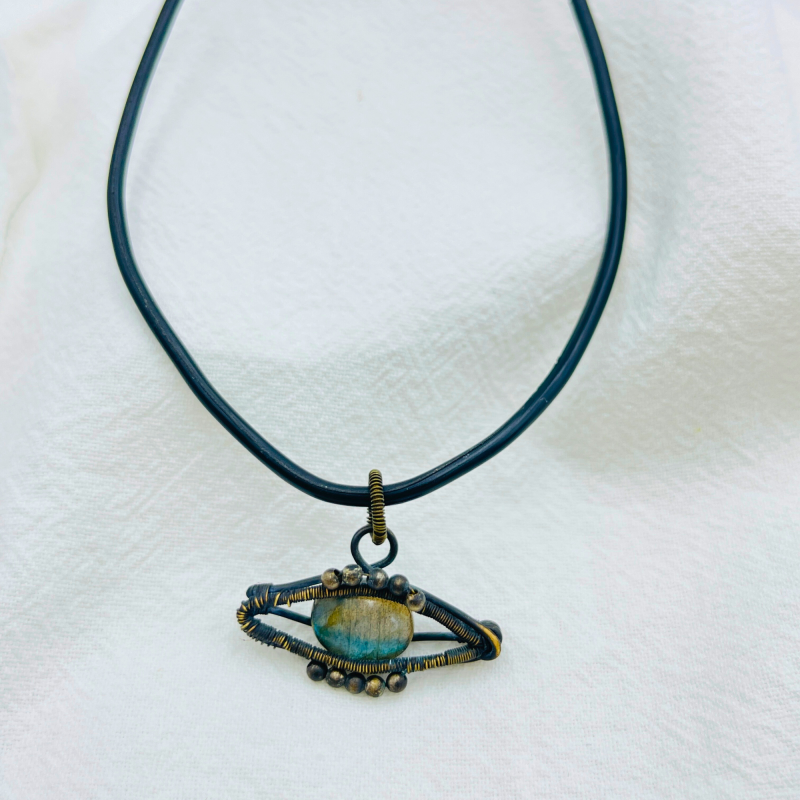 The labradorite cabochon is embraced by an intricately designed copper wire frame, handcrafted to form the shape of a protective evil eye. This ancient symbol, known for its power to ward off negative energies, takes on a celestial aspect in this unique design. The meticulous wire work creates lifelike eyelashes above and below the "eye," adding depth and realism to the piece. The warm, antique tones of the copper create a beautiful contrast against the cool, shimmering hues of the labradorite, like the interplay of starlight and cosmic dust.