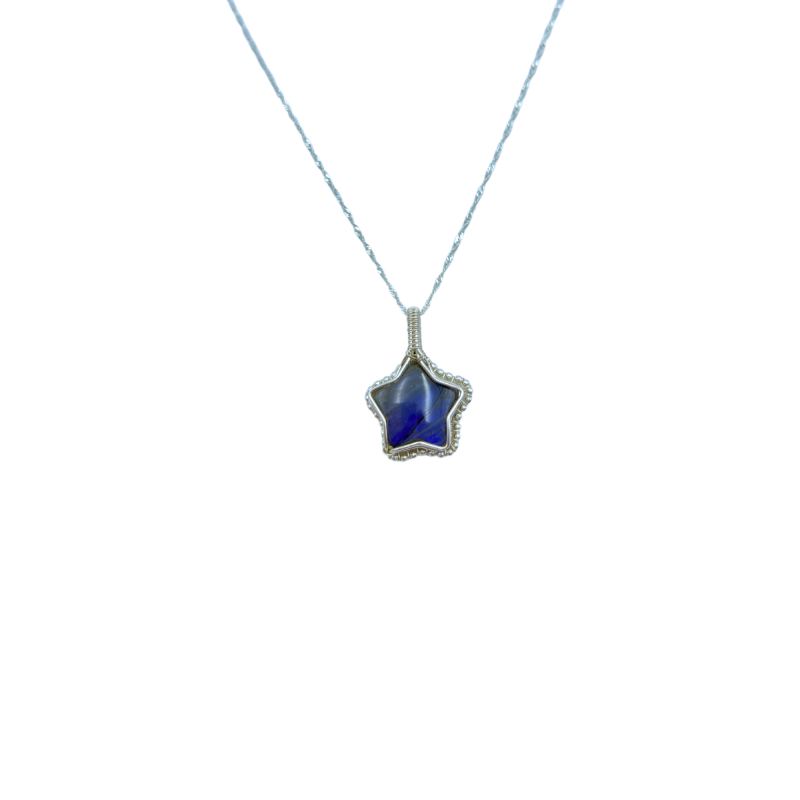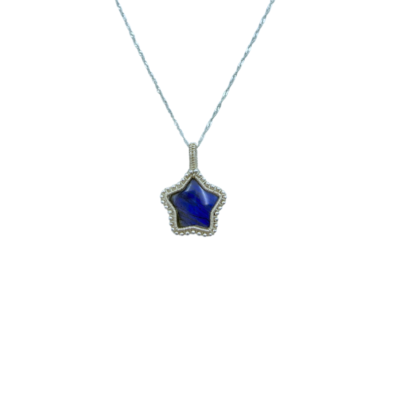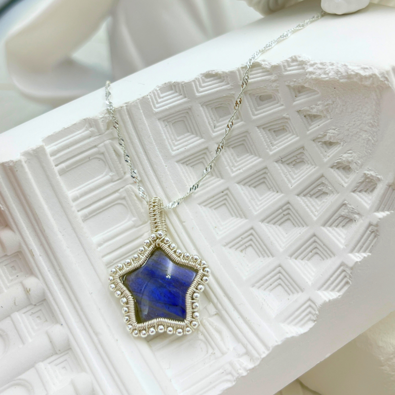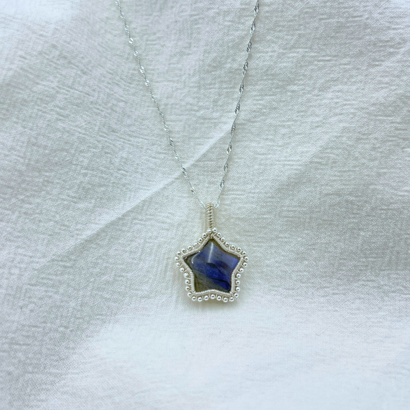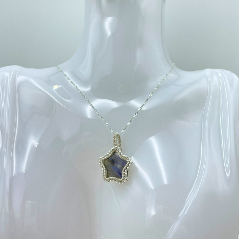 The star-shaped labradorite is embraced by an intricately designed copper wire frame, handcrafted to enhance the celestial form while evoking the golden gleam of Athena's armor. This delicate wirework not only adds structural elegance to the piece but also creates a beautiful contrast against the shimmering hues of the labradorite. Interspersed within the copper framework are silver beads, like tiny stars in the night sky or droplets of divine inspiration, adding a touch of celestial light to the wise palette.