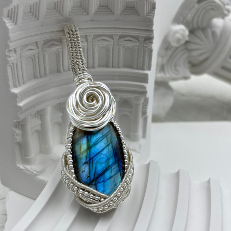 The labradorite is embraced by an intricately designed silver wire frame, handcrafted to resemble a swirling galaxy. This luxurious, wide border features dense wire wrapping techniques that create a sense of movement and depth, mirroring the dynamic brushstrokes of Van Gogh's masterpiece. The front-to-back weaving method envelops the stone like a gentle nebula, transforming the pendant into a radiant planet suspended in the vastness of space.