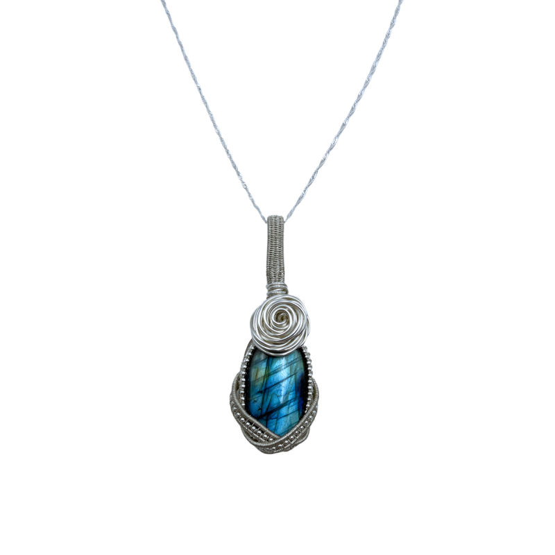 The interplay between the cool silver tones of the wire work and the vibrant, changing colors of the labradorite creates a visual symphony that captures the essence of a starry night. This attention to detail transforms the pendant into a wearable piece of art that bridges the gap between terrestrial craftsmanship and celestial wonder.