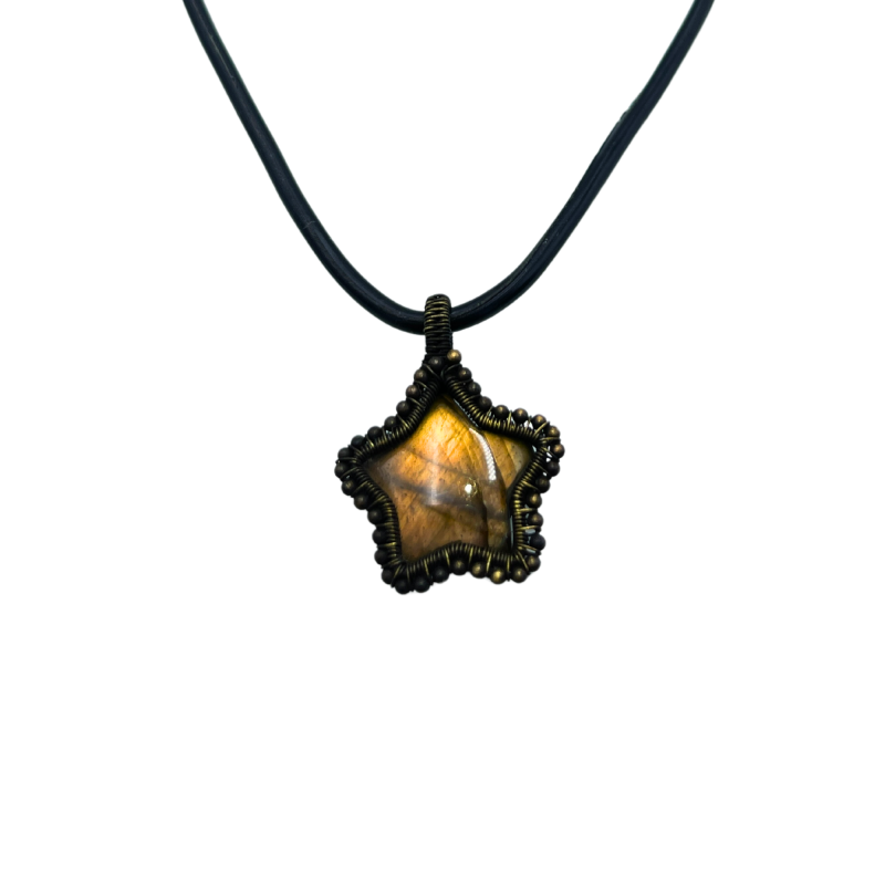 The sun-shaped labradorite is embraced by an intricately designed antique copper wire frame, handcrafted to enhance the celestial theme with delicate star motifs and swirling patterns reminiscent of Apollo's lyrical melodies. This vintage-inspired framework not only adds structural elegance to the piece but also creates a beautiful contrast against the shimmering hues of the labradorite, like the interplay of sunlight and shadow in the early morning sky.