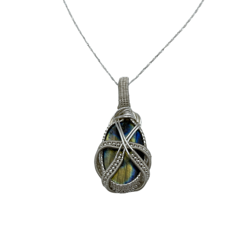 The interplay between the cool silver tones of the wire work and the vibrant, changing colors of the labradorite creates a visual symphony that captures the essence of a bohemian's interpretation of the universe. This attention to detail transforms the pendant into a wearable piece of art that bridges the gap between earthly craftsmanship and celestial inspiration.