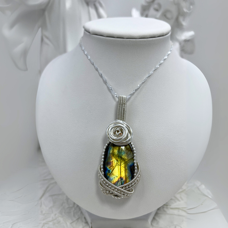 The labradorite is embraced by an intricately designed silver wire frame, handcrafted to resemble a swirling galaxy. This luxurious, wide border features dense wire wrapping techniques that create a sense of movement and depth, mirroring the dynamic energy flows of the cosmos. The front-to-back weaving method envelops the stone like a gentle cosmic current, transforming the pendant into a radiant planet suspended in the vastness of space.