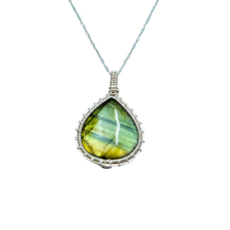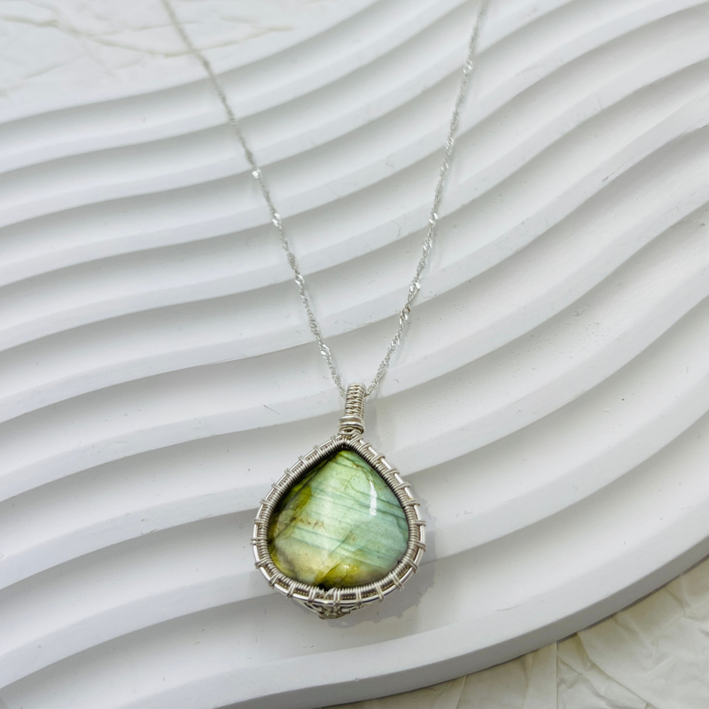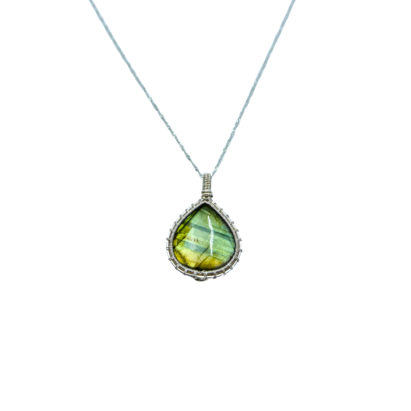Each COSMIC LOVE pendant is as unique as the labradorite at its center, ensuring that your piece is truly one-of-a-kind. The interplay between the copper wirework and the shimmering labradorite creates a harmonious blend of terrestrial and celestial elements, resulting in a wearable piece of art that seems to hold the secrets of the cosmos within its depths.