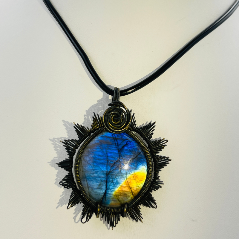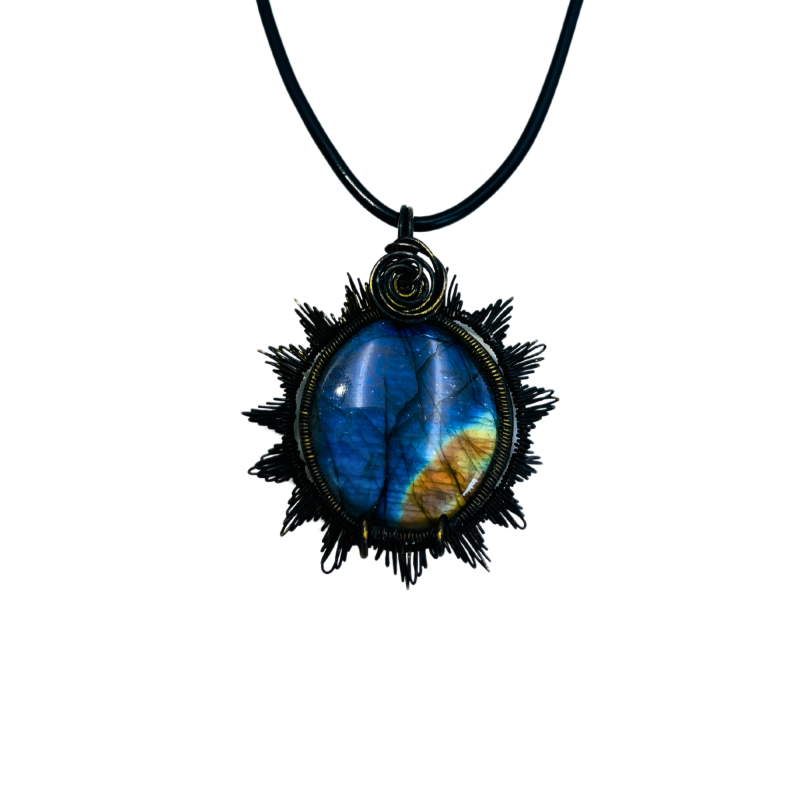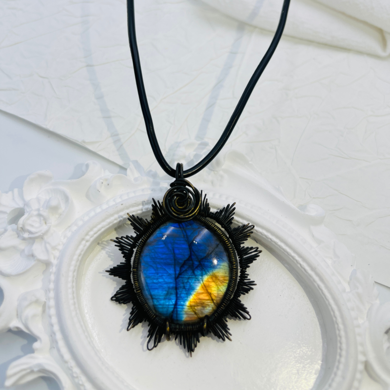 Embrace the enduring beauty of our Diamond Earth pendant, featuring a stunning natural Indian labradorite stone meticulously hand-cut and surrounded by an intricate copper wire frame with radiating triangular patterns. This 18.8-gram masterpiece showcases the stone's mesmerizing labradorescence, evoking the eternal brilliance of a diamond and the ever-changing hues of Earth. The elegant design, with its outward-spreading triangles resembling continuous waves, creates a truly captivating accessory that embodies strength and eternity. Perfect for those who appreciate the fusion of natural beauty and symbolic jewelry, this pendant represents the enduring nature of our planet and the timeless allure of precious gems. Whether worn as a statement piece or a daily reminder of Earth's resilience, Diamond Earth adds a touch of celestial elegance to any outfit.