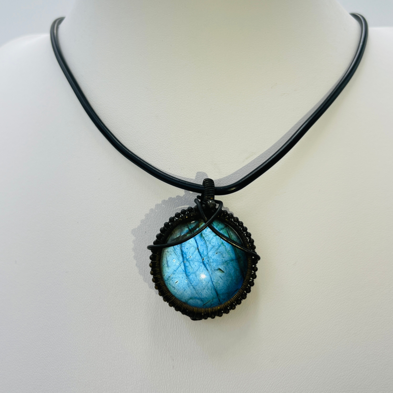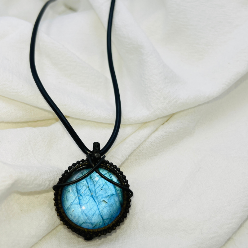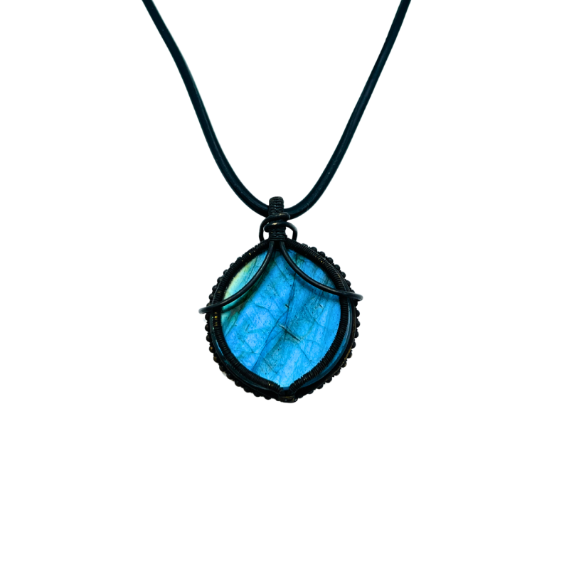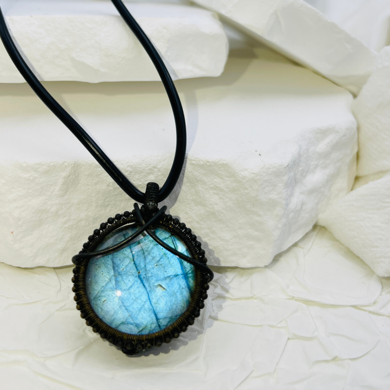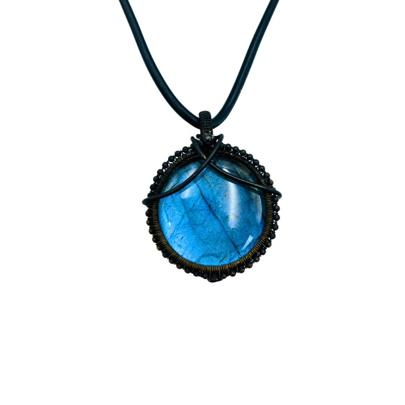 Each EMERALD ELEGANCE pendant is as unique as the labradorite at its heart, ensuring that your piece is truly one-of-a-kind. The combination of the vintage copper work and the shimmering labradorite creates a harmonious blend of timeless sophistication and natural wonder, resulting in a wearable piece of art that seems to radiate refined beauty.
