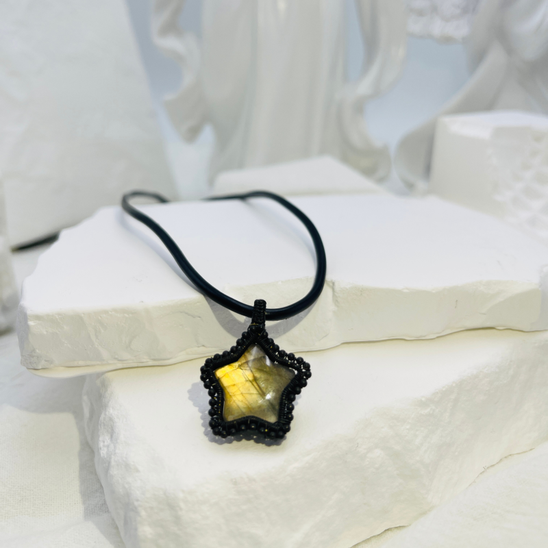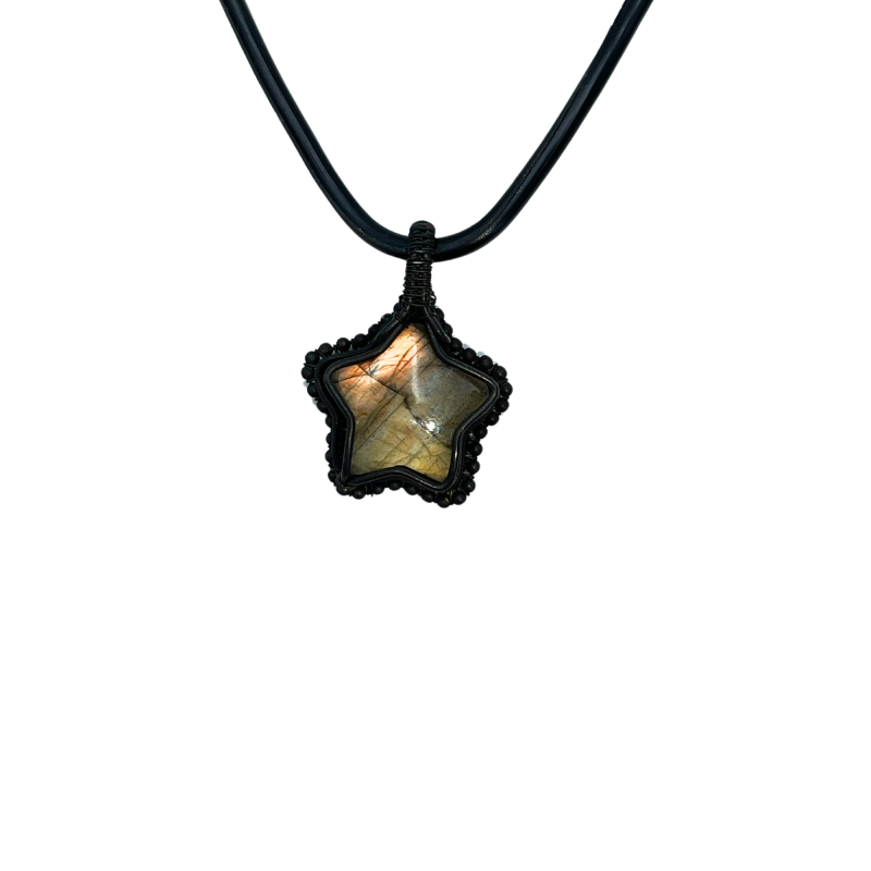The star-shaped labradorite is embraced by an intricately designed copper wire frame, handcrafted to enhance the compass motif while evoking the warm glow of aged brass instruments. This delicate wirework not only adds structural elegance to the piece but also creates a beautiful contrast against the shimmering hues of the labradorite. Interspersed within the copper framework are silver beads, like tiny stars guiding the way or the cardinal points of a compass, adding a touch of celestial light to the vintage palette.