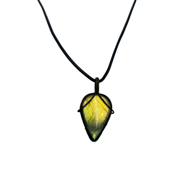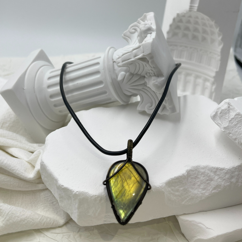 Embrace the radiance of hope with our Golden Dream pendant, featuring a mesmerizing natural Indian labradorite stone meticulously hand-cut into a unique radish heart shape and embraced by intricate vintage copper wire work reminiscent of sunbeams. This 13.7-gram masterpiece showcases the stone's captivating labradorescence, evoking the shimmering colors of golden aspirations. The innovative reversible design, with its figure-eight front and decorative back, creates a truly versatile accessory that embodies both timeless elegance and future possibilities. Perfect for dreamers and those who seek to manifest their deepest desires, this pendant represents the golden light of hope and the transformative power of imagination. Whether worn to display its sunlit elegance or reversed to reveal its intricate back, Golden Dream adds a touch of vintage charm and inspirational energy to any outfit.