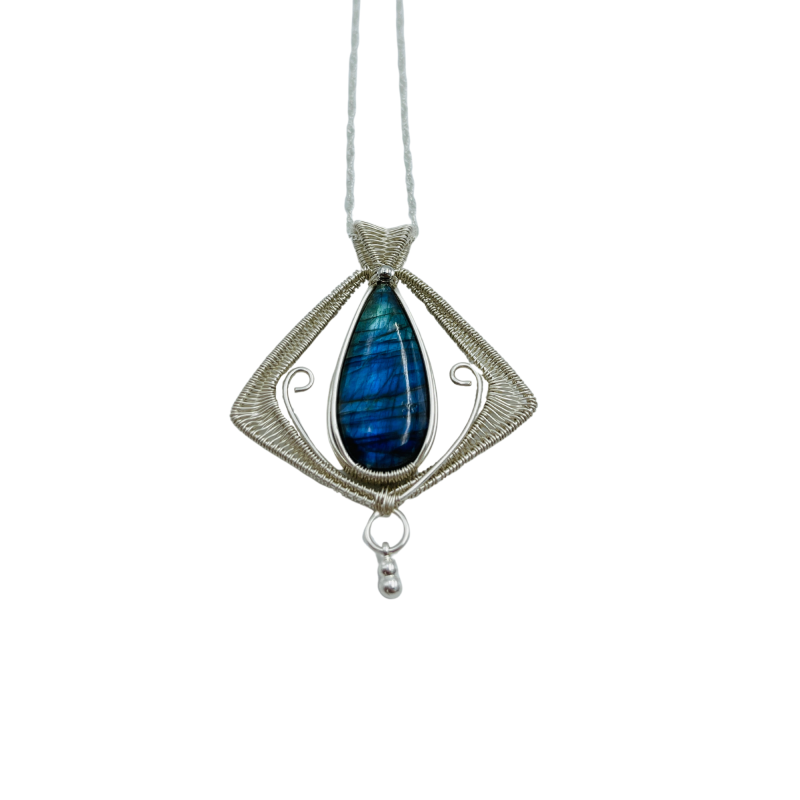 Weighing a thoughtful 7.4 grams, this pendant carries the essence of ancient knowledge while remaining light as a whisper from the past. The labradorite stone at its heart has been expertly hand-cut into an elegant oval cabochon, reminiscent of a portal to another time and place. As light dances across the surface of the stone, you'll witness a spectacular display of blues, greens, purples, and golds, mirroring the kaleidoscopic beauty of the ocean and the technological marvels of the advanced Atlantean civilization.