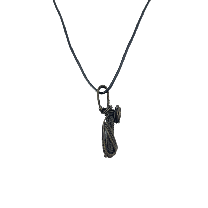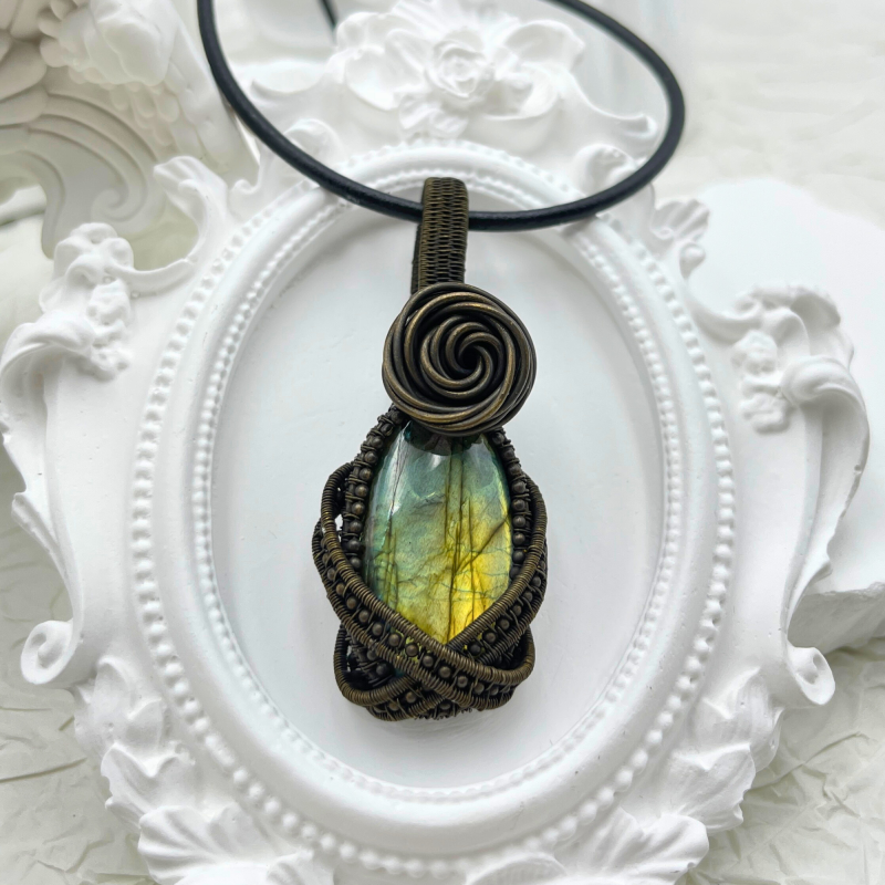 The labradorite is embraced by an intricately designed silver wire frame, handcrafted to resemble the intricate patterns of woodland growth. This luxurious, wide border features dense wire wrapping techniques that create a sense of organic movement and depth, mirroring the complex ecosystems of a forest floor. A delicate ribbon-like wrapping encircles the stone, reminiscent of a gentle stream winding through the woods, transforming the pendant into a microcosm of forest life.