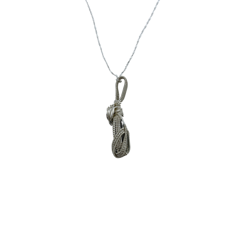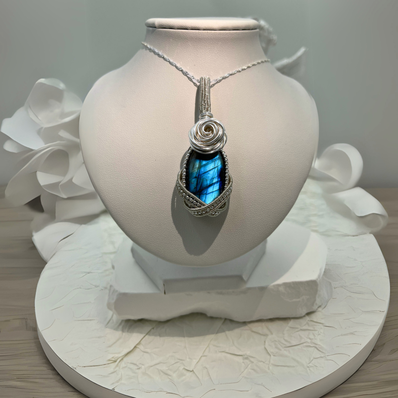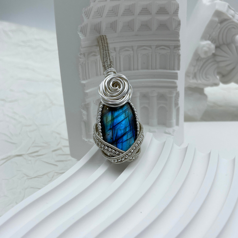 The labradorite is embraced by an intricately designed silver wire frame, handcrafted to resemble a swirling galaxy. This luxurious, wide border features dense wire wrapping techniques that create a sense of movement and depth, mirroring the dynamic brushstrokes of Van Gogh's masterpiece. The front-to-back weaving method envelops the stone like a gentle nebula, transforming the pendant into a radiant planet suspended in the vastness of space.